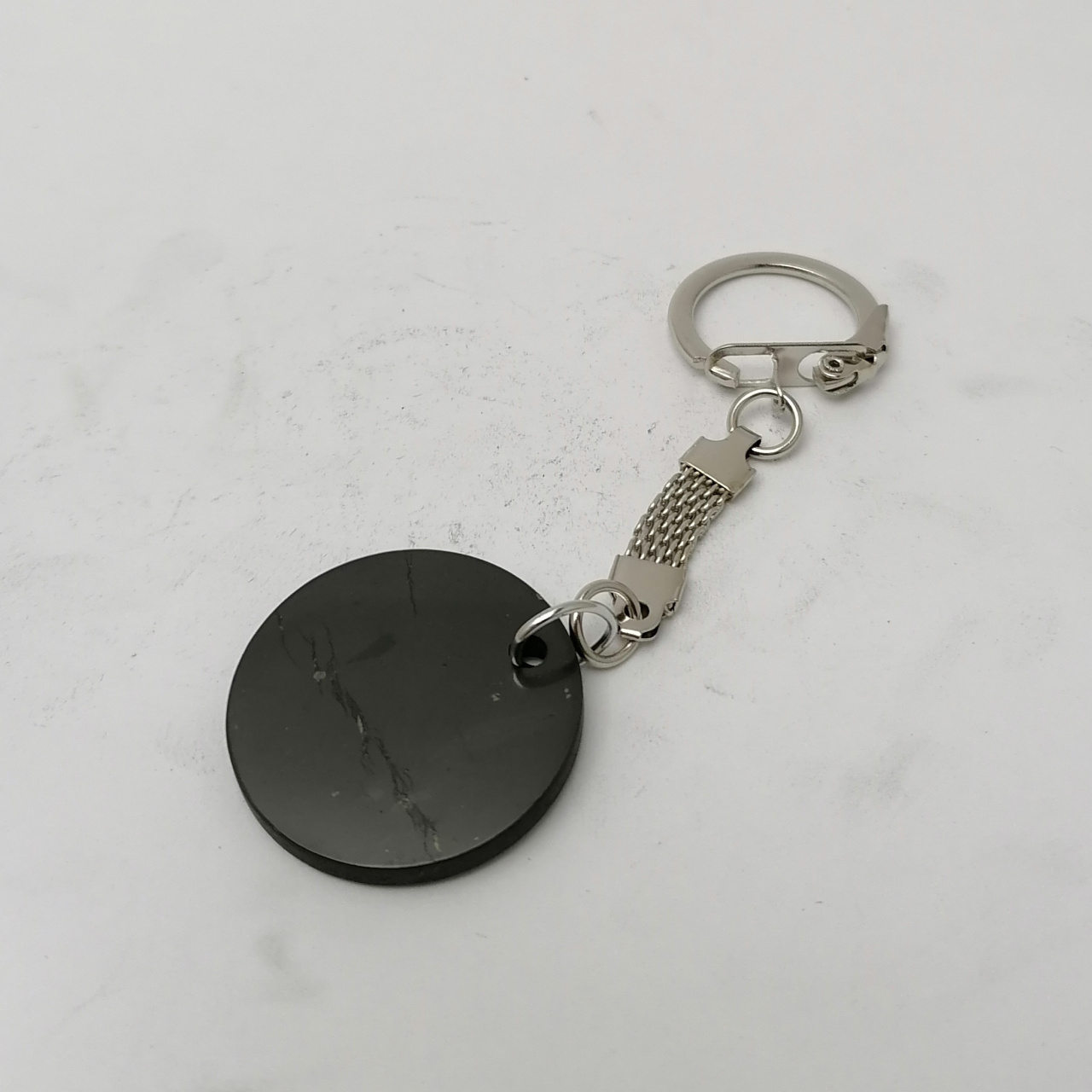 Keychain with natural shungite. The pleasant texture of the stone calms when touched, and the mineral itself protects against negative environmental influences, reduces the influence of surface radiation and electromagnetic radiation.