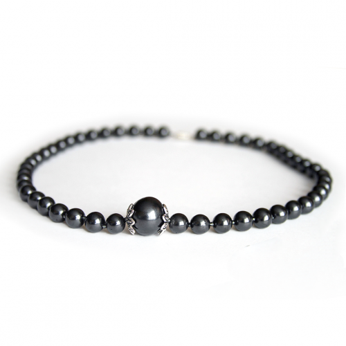 Shungite necklace has a positive effect on the body (especially on endocrine system), promote self-regulation and preservation of youth and beauty.The diameter of the beads is 7-8mm, 15mm (1pc), the length of the bead strand is 55 + -1cm.All beads are made of natural Karelian shungite from the Zazhoginsky deposit.A large bead is framed with jewelry spun inserts.