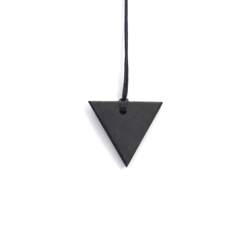 Shungite pendant in the shape of a downward-facing triangle, polished. Such a symbol is lunar and carries the symbolism of the feminine principle, water, cold, nature.Properties:Help the body to self-regulate,Restoring energy balance.Indications for wearing:Diseases of the thyroid gland,Vegeto-vascular dystonia,Decreased vitality.Waxed cord (80cm) included.