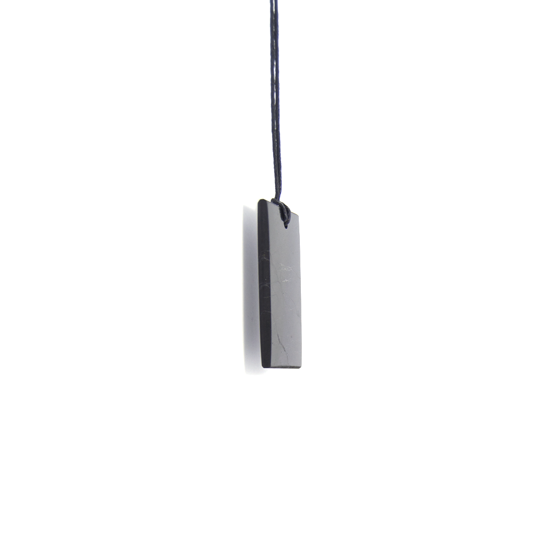 Rectangle polished shungite pendant.Properties:Help the body to self-regulate,Restoring energy balance.Indications for wearing:Diseases of the thyroid gland,Vegeto-vascular dystonia,Decreased vitality.Waxed cord (80cm) included.