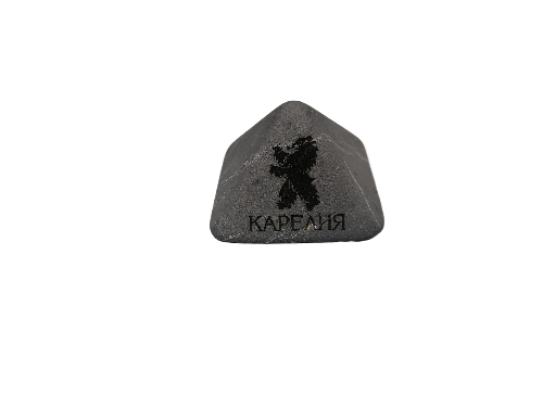An unpolished shungite pyramid that has passed a special stage of processing - tumbling, with the engraving ""Emblem Karelia"".The base of the pyramid - 5 cm.The radius of the pyramid is 5 meters.